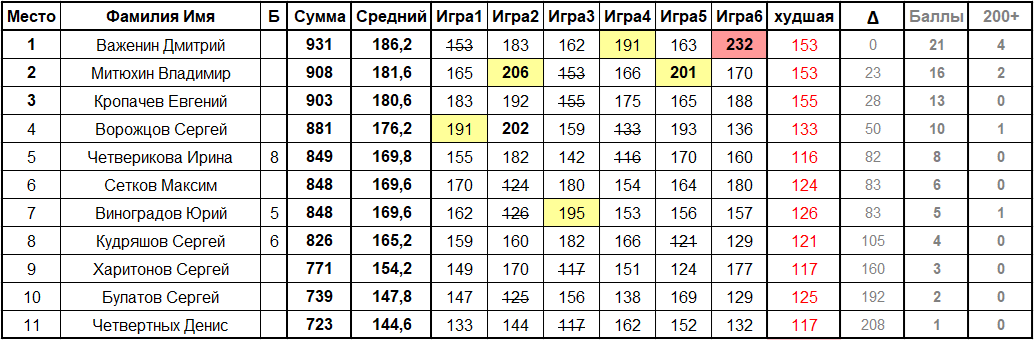 но точный математический расчет всегда должен брать в себя и расчет вероятностей для чего не обязательно знать все формулы из раздела статистики, достаточно было просто после закрытого фрейма сделать четверипл Важенину Дмитрию и как будто и не было предыдущих пяти с половиной игр — финишное ускорение еще серией страйков и 232 от Дмитрия — отличный ориентир на лучший результат сезона (год назад так же победу с лучшим результатом 233 забрал Четвертных Денис) — отличная практика не начинать сезон с «раскачки», лидер после пяти игр Ворожцов Сергей растерял добивания — второй результат в район 130-140 недопустим для победы и даже открытый 9й фрейм от Митюхина Владимира не стал «приговором» — пара страйков в 10м фрейме и набор очков достаточен для призового места, так же серия из 9 спэйров от Кропачева Евгения в сумме с страйк+спэйр в десятом это оказался проход в призовую тройку…
