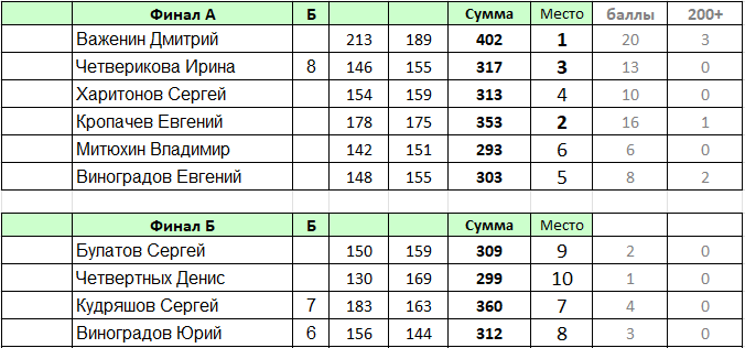 далее неравномерный остаток времени изменил формат финалов (6 и 4, а не 5 и 5), финал Б за явным преимуществом выиграл Сергей Кудряшов (с учетом гандикапа отличная сумма 360)