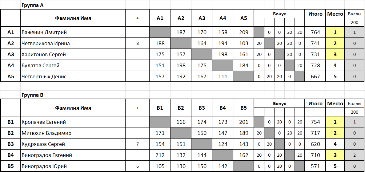 во второй группе результаты оказались ниже из-за большого кол-ва игр на 8й дорожке (не все любят эту дорожку, а уж про то сколько ругают лучше не вспоминать), небольшая разница лишь между Владимиром Митюхиным и Евгением Виноградовым занявшими 2е и 3е место в группе пропустив вперед показывающего стабильную игру Евгения Кропачева